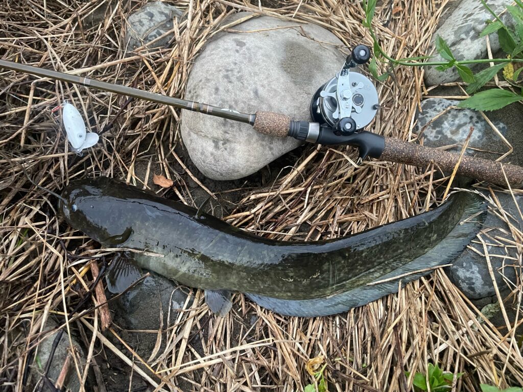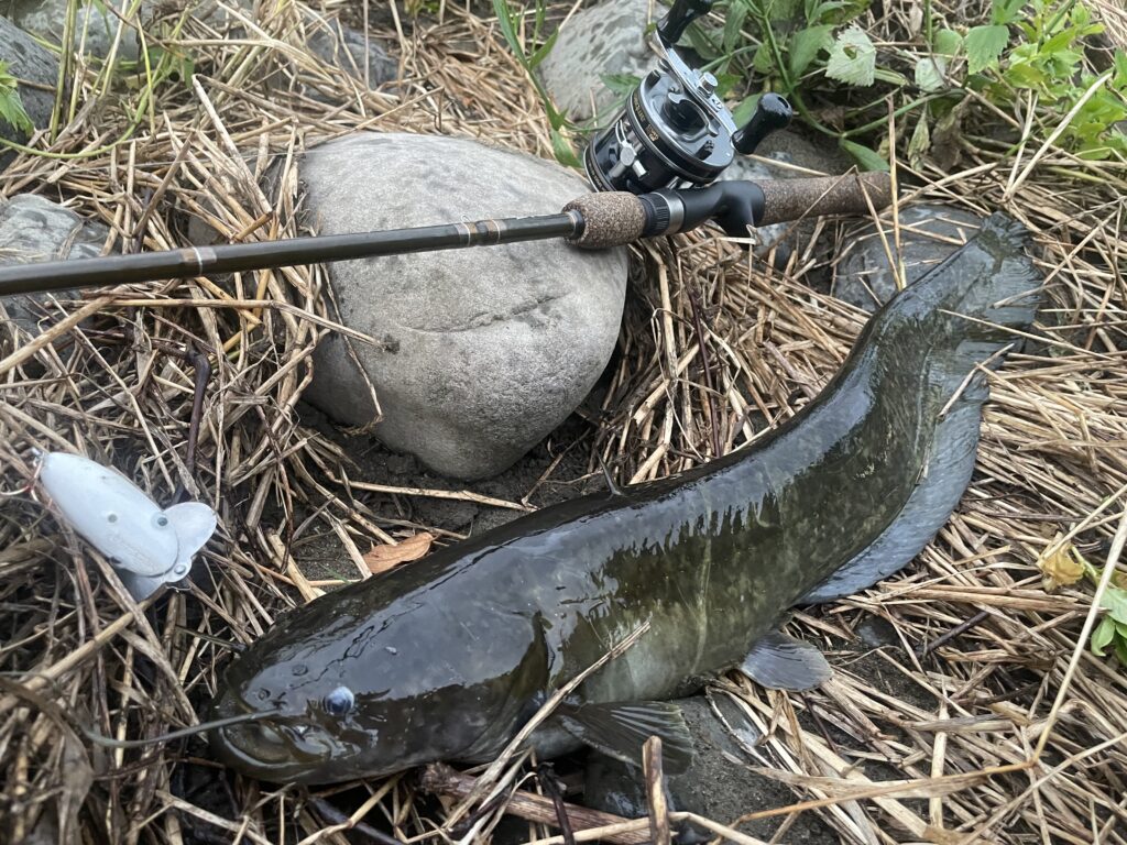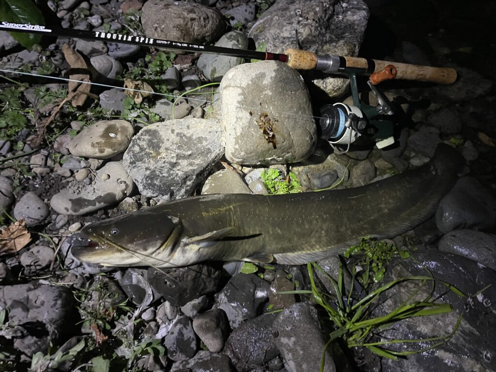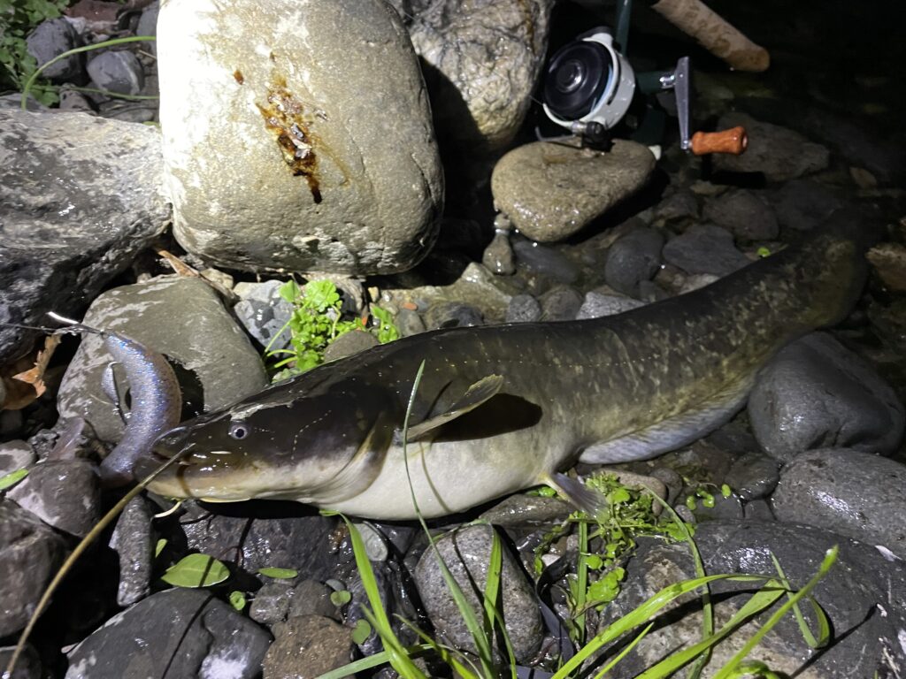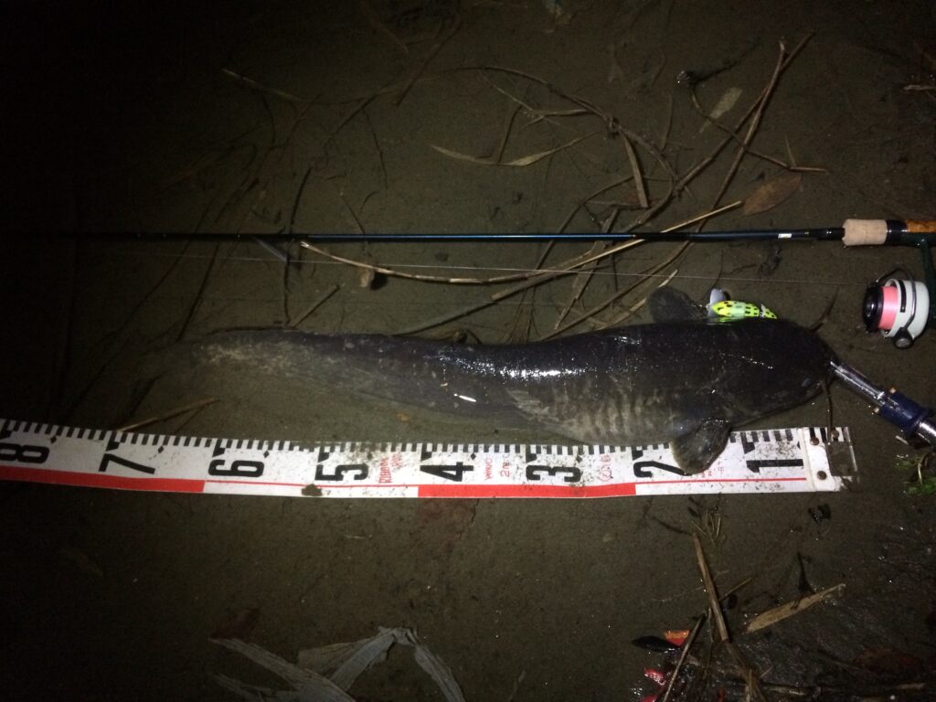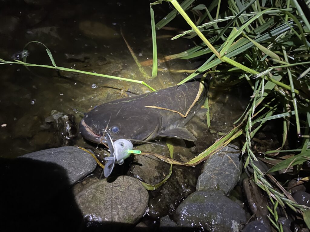なので極力ナマズにはダメージを与えないようフックはバーブレスで元気なうちにリリースするよう心掛けている。目の悪い私は暗がりでのライントラブルは致命傷なのでトラウト用スピニングタックルの7ftで使い慣れたカーディナル44を愛用している。魚とのやり取りの最中にドラグの強弱がつけ易いのが愛用の理由だ