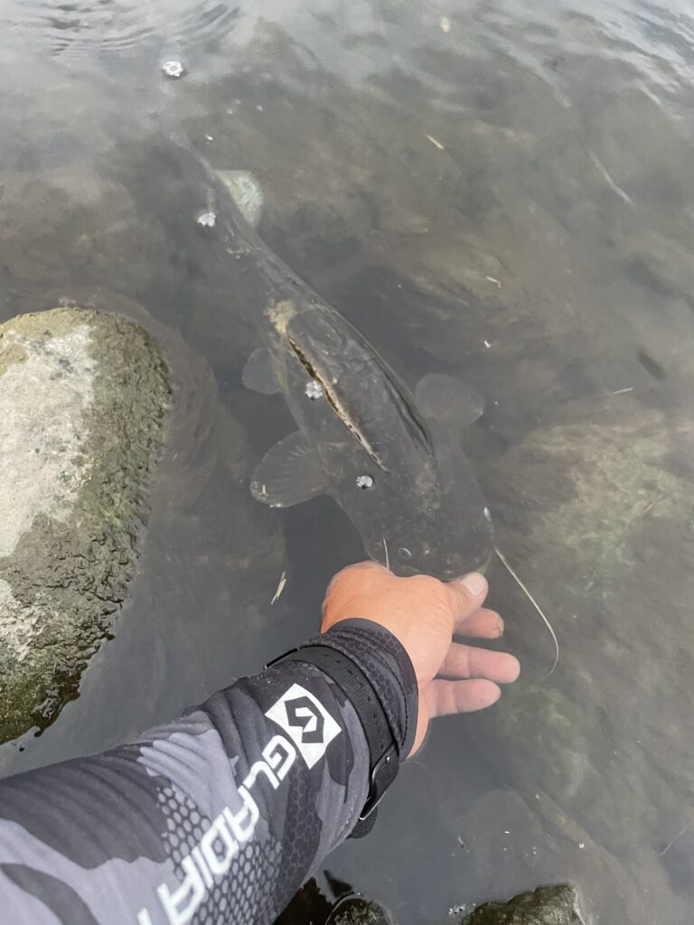 ルアーのサイズが小ぶりなので若鯰がよく掛かる。ナマズは夜間活発に活動し口元の長いヒゲのようなアンテナで水の流れや波動を敏感に感知し対象物の大きさや位置を感じている。目の方はあまり見えていないか?というと、そうでもなくて小魚の反転するキラッとした光にはよく反応する。朝まずめ夕まずめ時のスプーンルアーを使ったボトムバンプのナマズ釣りもとてもエキサイティングだし彼らはなぜかスピナーベイトが大好物でよくかかってくる。