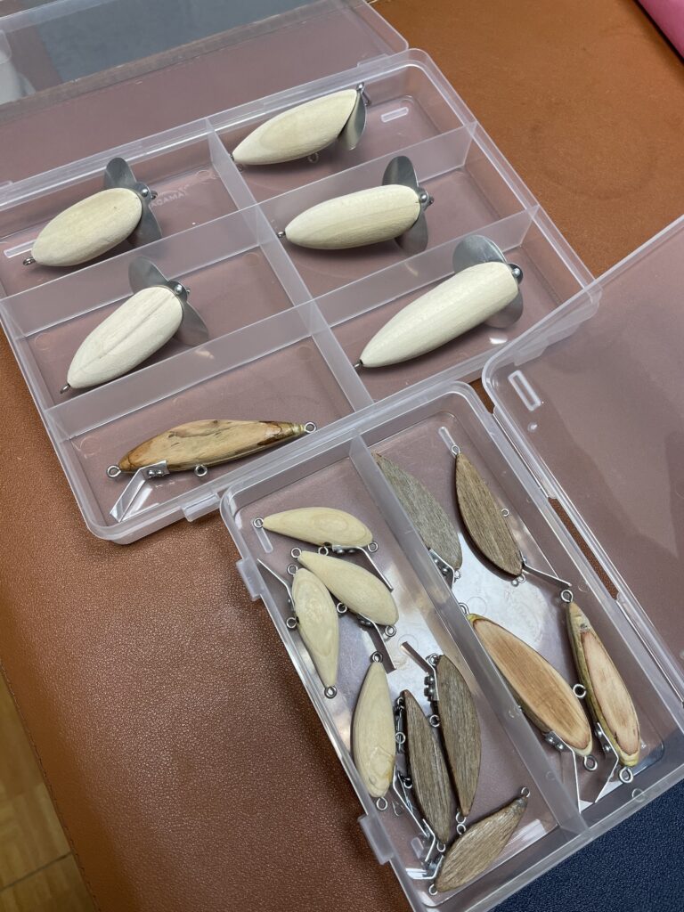 釣りものの少なくなる冬の間、部屋にこもって木を削り来シーズンの釣りを想いながらルアーを作る時間が好きです。こうやって幾つか作ったルアーにもアタリハズレがありそれもまたルアー釣りの奥行きとして楽しんでいます。塗装は私の場合、水性ペイントの白でナマズだったらそのまま使っても大丈夫です。水性ペイントなら気軽に塗り直したりできるし、作業中の臭いもほとんどない。問題があるとしたら水性ペイントだと釣り中に木が水分を吸って動きが鈍くなってくる事くらい。