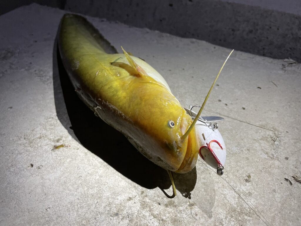 そう、話外れたがナマズ釣りでは水の波動が意識のポイントだ。ルアーの水押しでナマズを刺激する。そうするとルアーのカラーはあまり重要ではない気がする。
