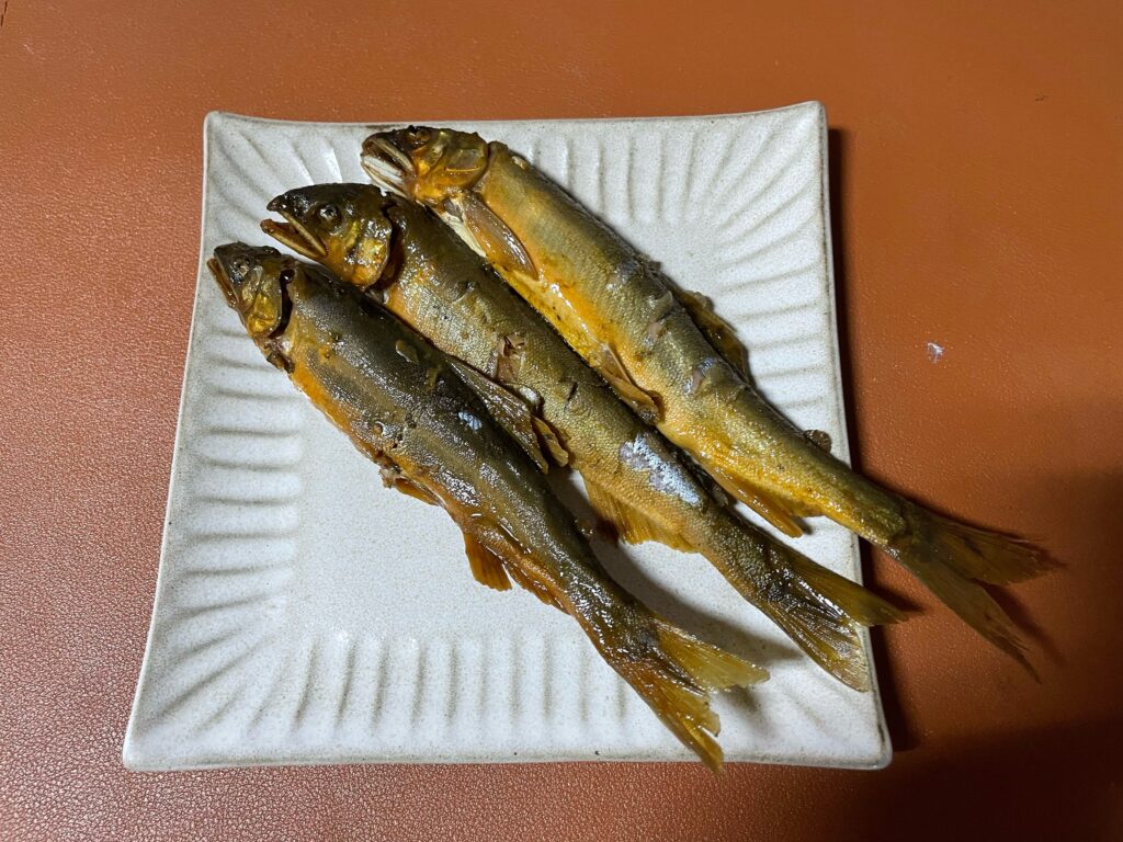 さあ!美味しく炊き上がった鮎を食べましょう!と箸をつけると、一口目から異様な風味が鼻を抜けました。河原のにおいを凝縮したような?? もう一口いくと今度はさらに強烈に相模湖を集めたようなやべーにおいです、、命を頂いた責任としてこの3匹は食べました。もう美味しいとかの話じゃなくこれはトラウマレベルです。食事の後も吐く息が相模湖のにおいですw
